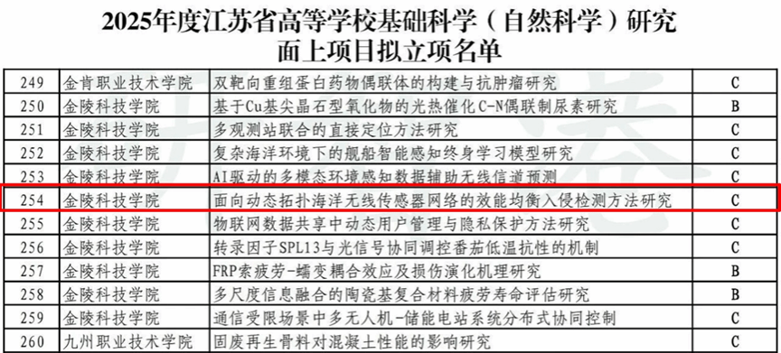 近日,江苏省教育厅公布2025年度省高校基础科学(自然科学)研究项目评审结果。我院侯天浩同志主持的《面向动态拓扑海洋无线传感器网络的效能均衡入侵检测方法研究》成功立项C类项目。