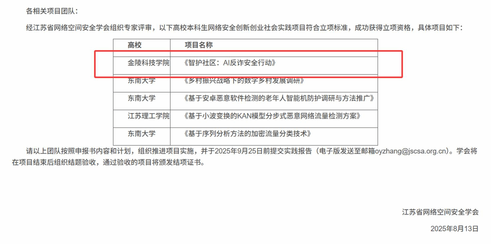 8月13日,江苏省网络空间安全学会公布2024年高校本科生网络安全创新创业社会实践项目立项结果,WilliamHill中文申报的《智护社区:AI反诈安全行动》成功获批。全省仅5个项目入选,我院项目聚焦人工智能反诈技术,服务社区安全,充分展现学生创新实践能力与社会责任担当。项目团队将按申报计划推进实施,并于9月25日前提交实践报告,迎接省级结题验收。