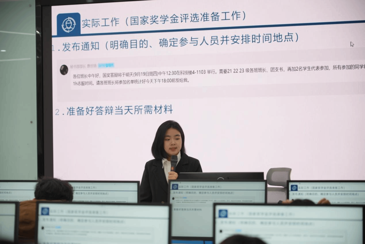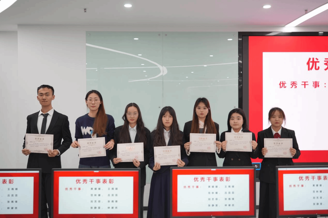 会议伊始,学院主席团代表钟宇震发表了热情洋溢的讲话。他充分肯定了学生干部队伍在推动学院工作和服务师生中发挥的重要作用,总结了过去一年学院在学生管理、活动组织等方面取得的显著成绩。同时,主席团代表也对学生干部提出了更高的期望,号召全体干部加强责任意识和服务意识,不断创新工作方式,为学院发展贡献力量。随后,进入大会的重点环节——部门代表经验分享。来自各部门的优秀干部依次登台,结合实际工作情况,分享了宝贵经验和心得体会:生活部代表王雨晴详细讲解了如何高效传达活动精神并提升沟通质量,帮助团队更好地协调配合。外联部代表林谢优以实际案例为基础,分享了如何与外部资源建立联系并策划高质量活动的具体方法。学习部代表范秋媛为在场干部提供了关于活动组织及学习资源管理的实用建议。文体部代表张静雯重点探讨了如何丰富校园文化活动的形式,增强活动的吸引力和参与度。秘书部代表吕蕊蕊分享了信息搜集、整合与高效利用的实用技巧,帮助干部优化日常事务管理。与会干部认真聆听,各部门的经验交流为大家今后的工作提供了切实可行的思路,赢得了阵阵掌声。经过严格评选,黄媛媛、王雨晴、范秋媛、吕薇薇、刘艺菲、张雨锋、张静雯、林谢优等多名学生干部荣获“优秀干部”称号。他们的努力和奉献,不仅为学院工作注入了活力,也为其他干部树立了榜样。